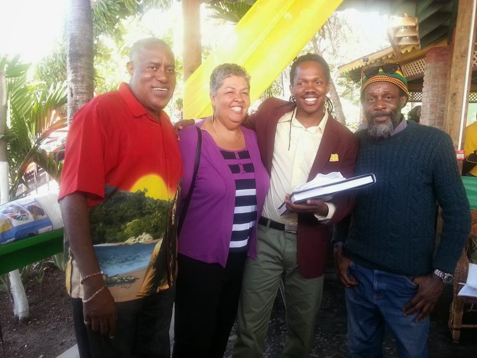 H.E. Aloun Ndombet-assamba, Jamaican High Commissioner to London, Hon. Minister Damion Crawford, Minister of State, Ministry of aTourism and Entertainment, Lindsay Donald and Colin Oliver Leslie. Bob Marley Day, Bob Marley Museum. Lindsay presents his book, 'Portrait of a Legend and other Folks' to the Minister.